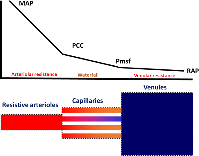 - The arterial and venous resistances determine the “vascular waterfall” that contributes to the maintenance of organ perfusion even in low-flow conditions [8,9,10,11]. Even if MAP decreases to P cc, a pressure gradient between P cc and P msf is still maintained (View Highlight)