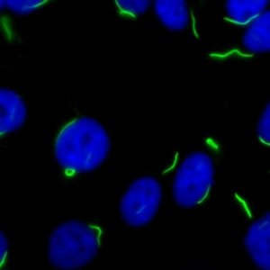 Note the discrete speckles (40-80/cell) with intense staining of the metaphase end plate(🔺)
