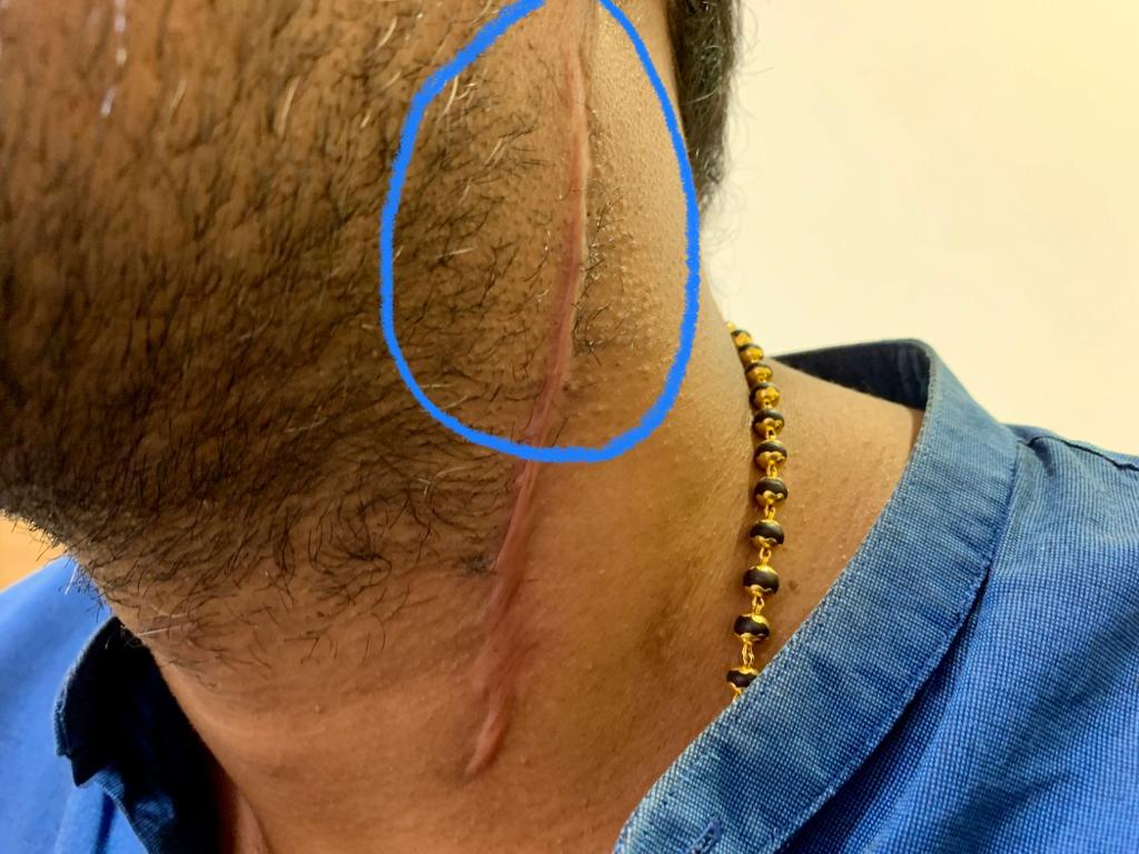 - Big scar on his neck and pain roughly in the encircled area. Deficits are left horners, left vocal cord palsy, left XIIth nerve palsy