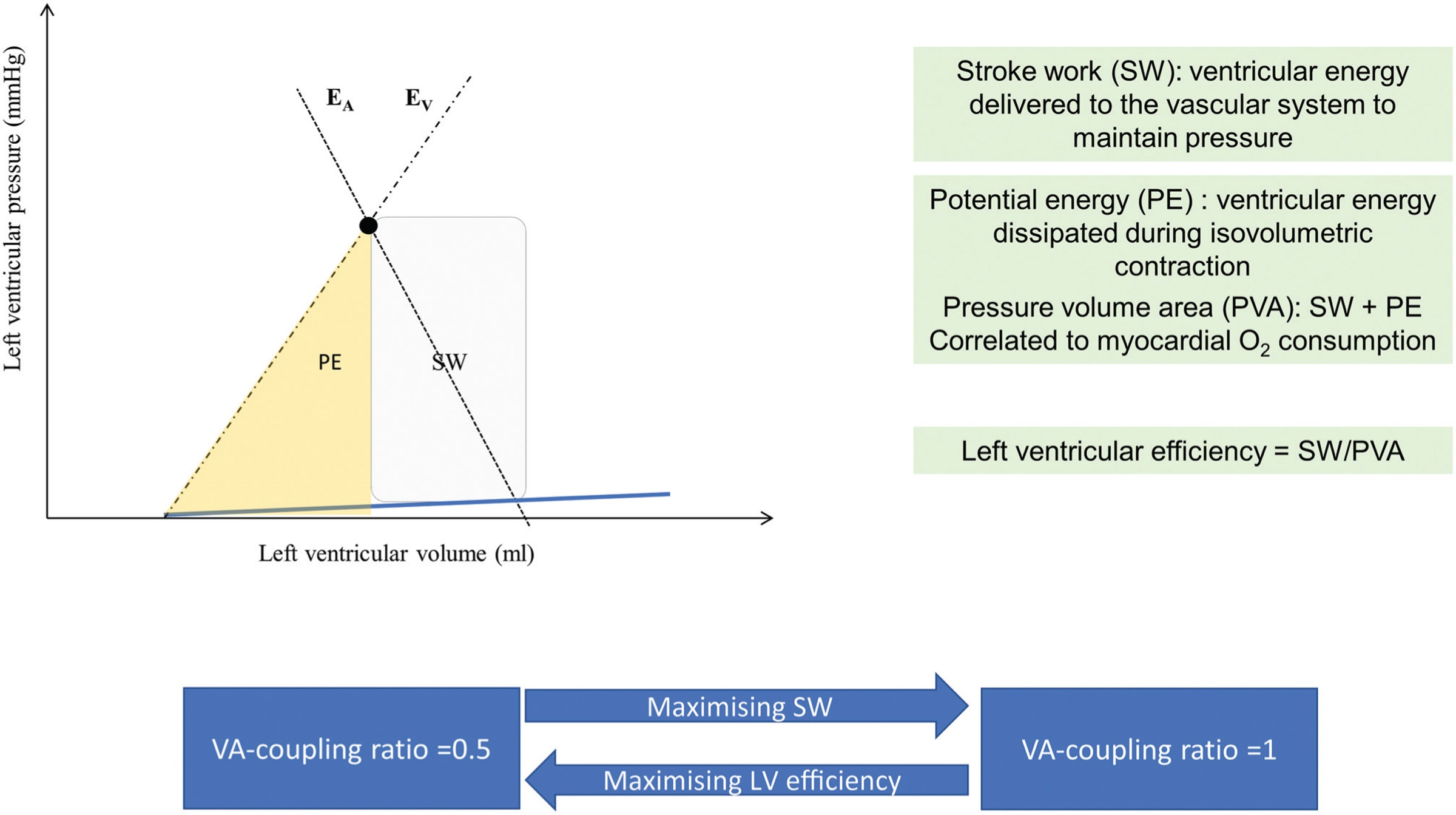 “During stressful haemodynamic situations, stroke work is maximised, reaching a maximum EA/EV ratio of 1.1 The energetic balance of the cardiovascular function is optimal when EA/EV is 1, whereas at a ratio of 0.5, maximal cardiac efficiency is observed.” Go to annotation (Guinot et al., 2022, p. 4)